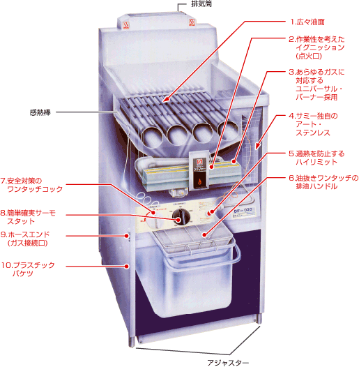 サミーのフライヤーは全て遠赤外線を使用、理想的な調理が可能です。