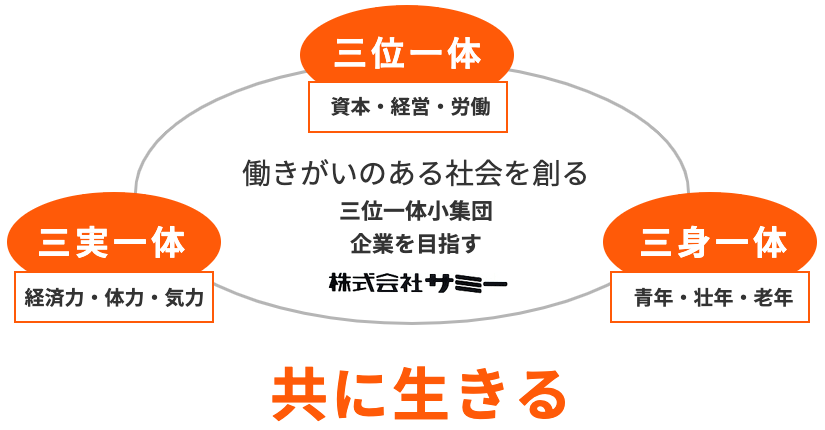 サミーは「三位一体」を基本とし、社員各自の身体の健康・心の健全化をはかり、経済の健全化のため、社会のニーズに答える製品づくりをしています。世の中が求める製品を創り出す事で社会に貢献し、仲間との協力によって楽しく働く事で自分自身の未来を築いていくことを目指しています。