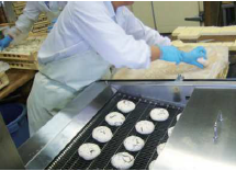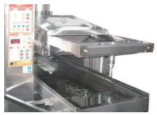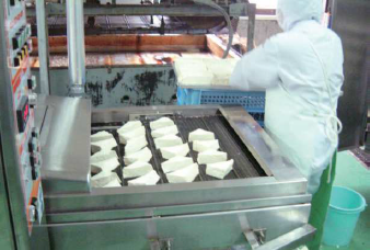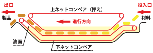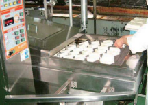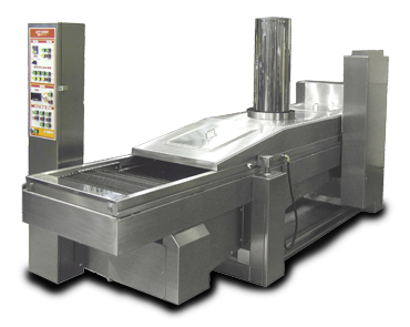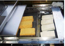 自動疑固成形機より直接フライヤーに投入される自動投入タイプ。