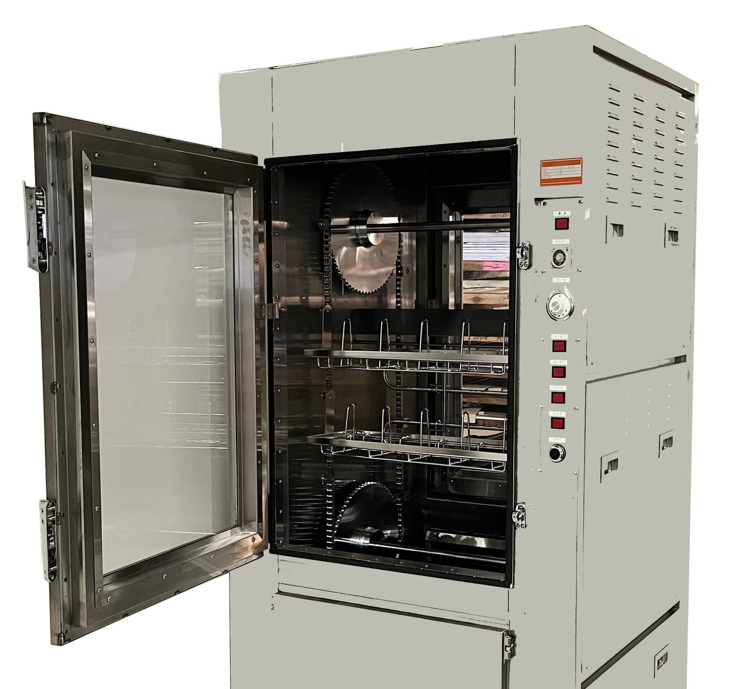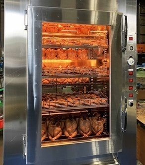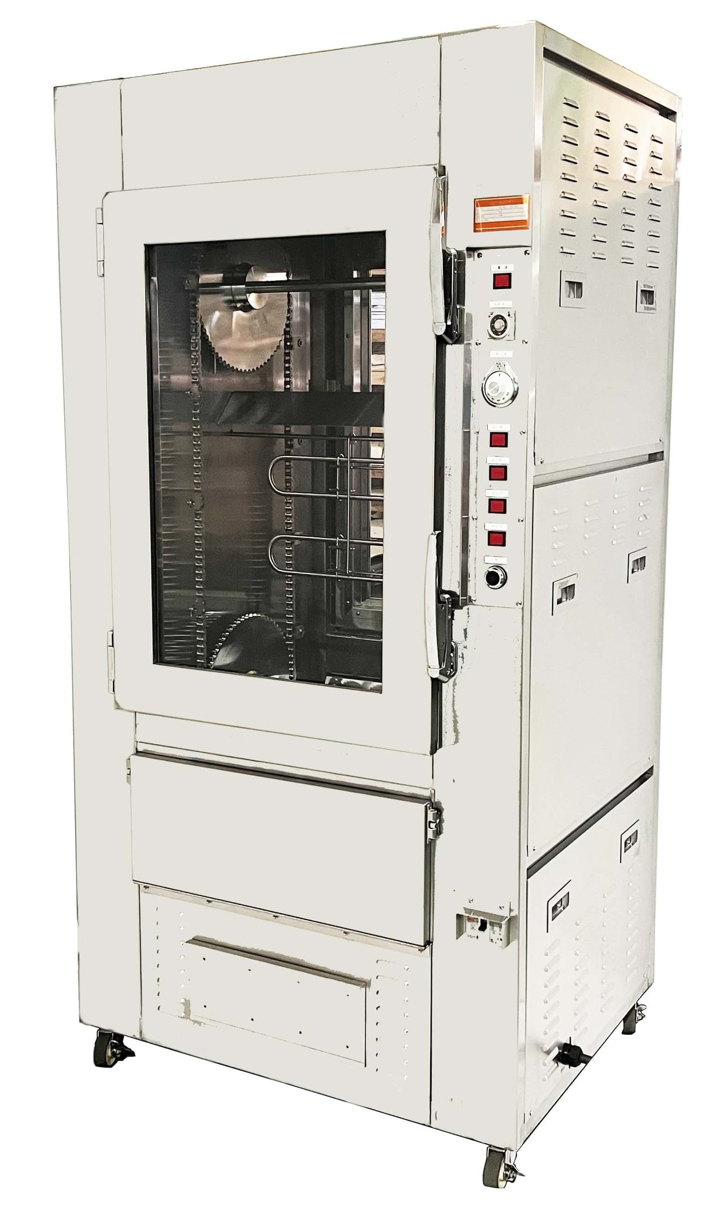 すばらしい味とテリのローストチキンを全自動でムラなく、早く焼き上げることができます。